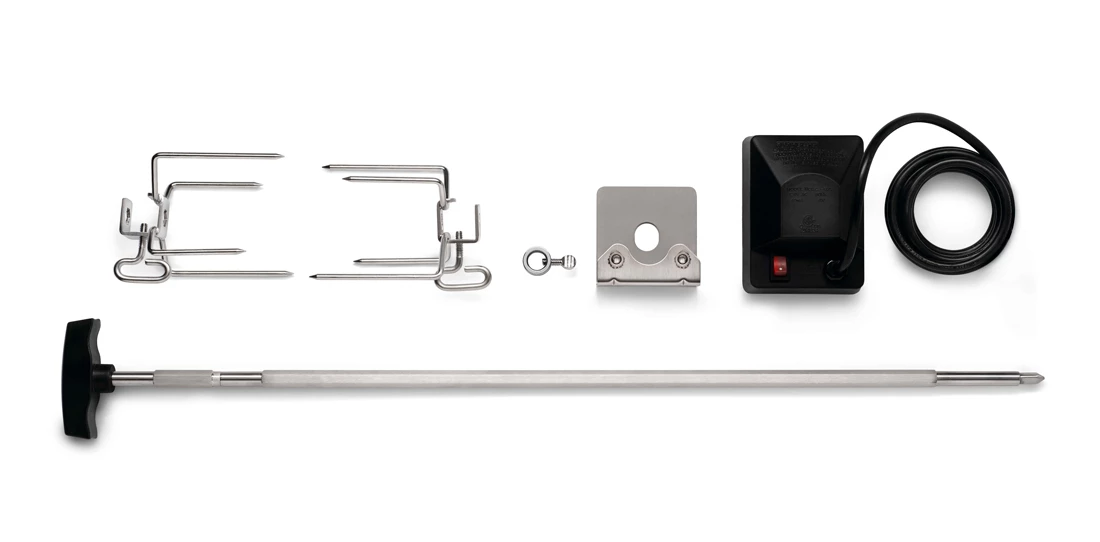 El motor de alta resistencia puede girar hasta 12 kilogramos de una carga equilibrada. Las dos tenazas de cuatro puntas sujetarán de forma segura todo lo que pueda desear asar y se ajustan de forma segura con tornillos de mariposa fáciles de usar.