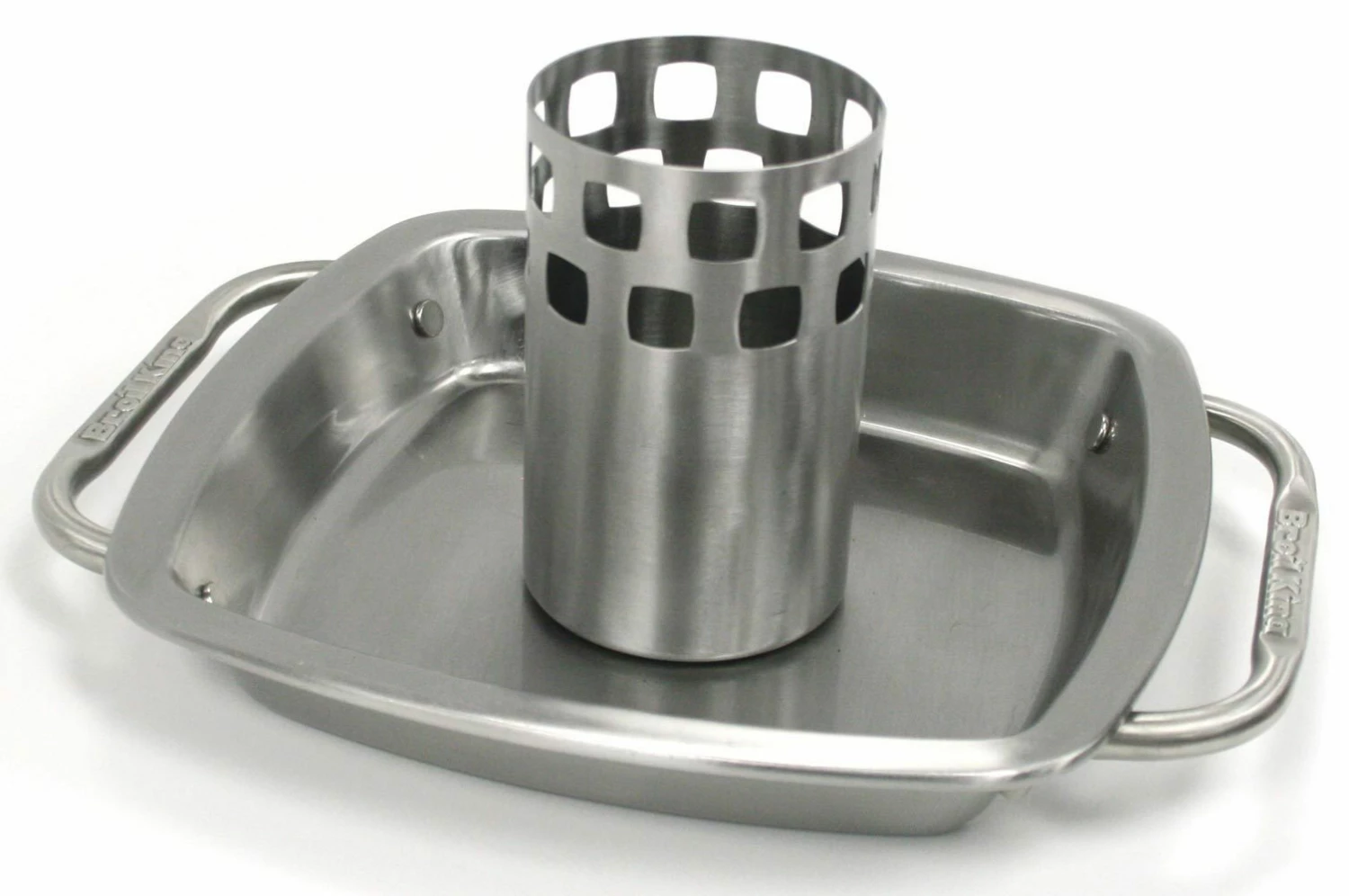 Fabricado 100% de Acero Inoxidable con una base de acero de 1,2 mm de espesor. Asas de gran tamaño, 10 mm. de espesor. El tornillo en la base del cilindro, nos facilita mantener de pie al pollo y poder echar la cerveza o cualquier otro líquido como vino, zumo, etc. El cilindro tiene una capacidad de una lata de cerveza (350 ml.) y además dispone de ventilación en la parte superior para darle mejor sabor al pollo.