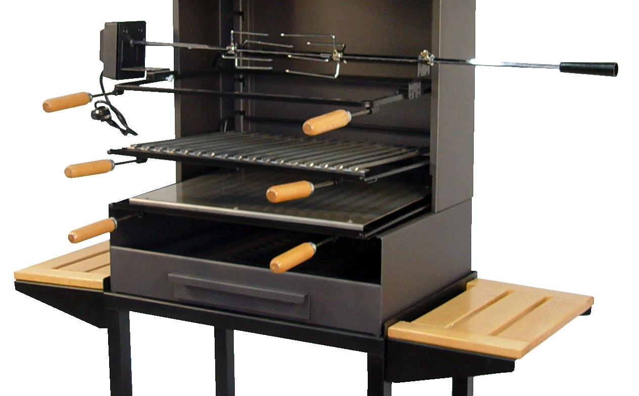 Las barbacoas de Imex El Zorro han sido completamente rediseñadas. Los cambios más relevantes a destacar son: Elegantes ruedas 4×4 para todo tipo de superficie, estantes laterales reforzados de madera, cajón recoge cenizas reforzado, parrilla del hogar de hierro fundido, cuba fabricada en acero de alta resistencia lo que nos permite poder usar leña sin problema.