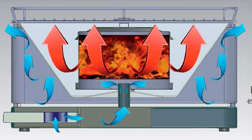 El ventilador sopla aire dentro de la cesta de carbón, lo que acelera el proceso de encendido y se alcanza la temperatura deseada rápidamente. El aire fluye a través del cuerpo de la barbacoa, manteniendo el exterior frío, incluso después de muchas horas de uso.