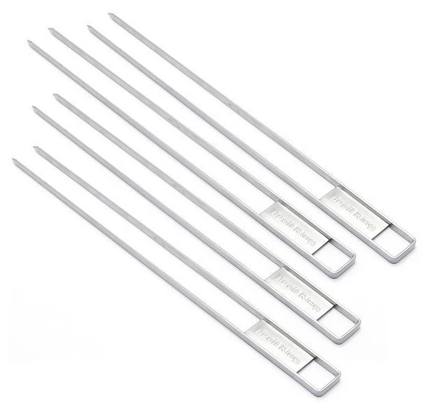 Juego de 4 brochetas dobles fabricadas en Acero Inoxidable de 1.2 mm. de espesor. Mangos con logo Broil King grabado. Fácil y rápido de limpiar.