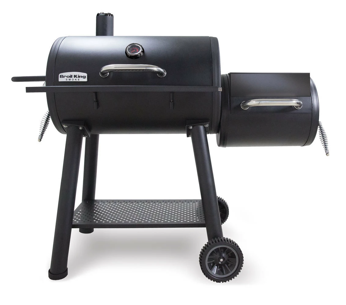 Esta barbacoa y ahumador horizontal de Broil King le permite cocinar todas sus comidas favoritas, el control de la temperatura es muy preciso gracias a la tecnología de válvulas de ventilación Roto-Draft, por lo que podremos ajustar fácilmente la barbacoa para que cocine lentamente a baja temperatura y por su puesto también a alta temperatura. El cuerpo y las 2 tapas de la barbacoa esta construido de Acero a partir de 2 mm. de espesor, con una superficie de cocción principal de 81 x 49 cm. y otra superficie de cocción secundaria de 40 x 36 cm., las robustas parrillas de cocción son de hierro fundido y hacen que retengan el calor con lo que conseguiremos dorar rápidamente nuestros alimentos, además son reversibles por un lado son canales huecos v y por el otro son en ^ ideal para dorar y marcar alimentos. Las bandejas para el carbón le ayudaran a añadir carbón y leña con facilidad. En cada cámara de cocción hay un cenicero de Acero Inoxidable extraible para una limpieza más fácil después de cada uso.