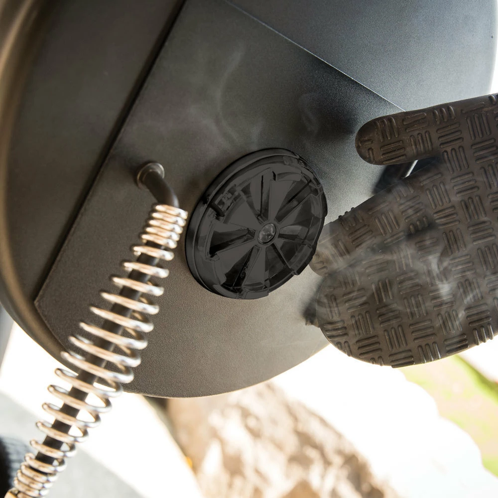 – 2 Bandejas de carbón en la cámara de cocción principal y parrillas para el carbón en la cámara pequeña, le permiten añadir su mezcla favorita de virutas de madera, carbón o leña fácilmente.