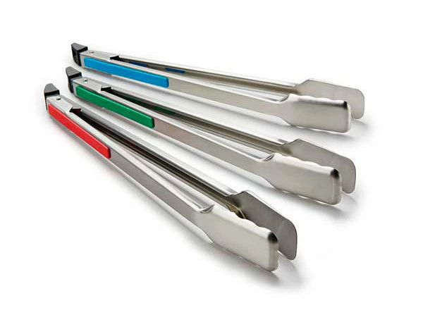 Pack de tres pinzas de Acero Inoxidable, cada una con el mango esmaltado en un color: verde, rojo y azul.