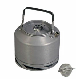 Esta tetera es de aluminio anodizado muy ligera e incorpora un asa plegable para su fácil transporte. Su tamaño es de 1,5 litros y cuenta con la tecnología anillo de calor que captura y transfiere el calor, incrementando la eficiencia real un 30% a la vez que reduce el consumo de combustible.