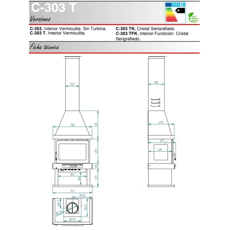 Chimenea de leña sin turbina. En el modelo C-303 hemos logrado la estética de una chimenea sin necesidad de obras de albañilería, haciendo muy confortable cualquier estancia en su hogar.