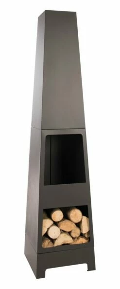 Llene de troncos la estufa fácil y cómodamente desde el compartimento de almacenaje de leña. Esta chimenea de Acero negro mate aporta calidez y elegancia a cualquier tipo de jardín.