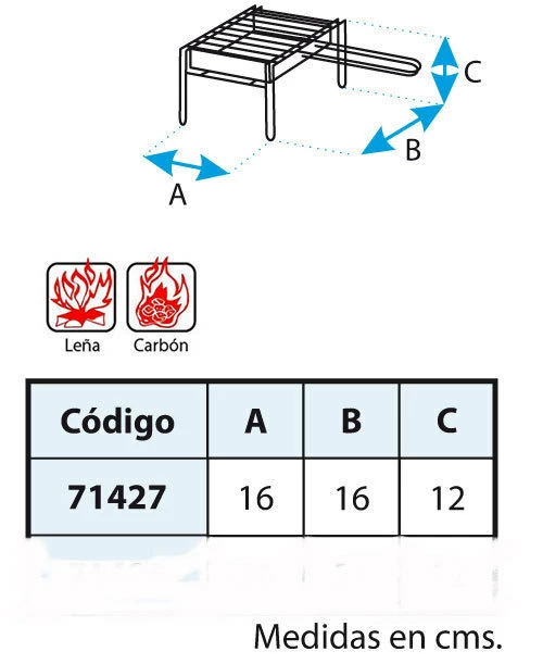 La misma parrilla de cocción deriva en cuatro patas de apoyo, y debajo de esta en un pequeño soporte se coloca el cajón que sostiene el carbón o la leña.