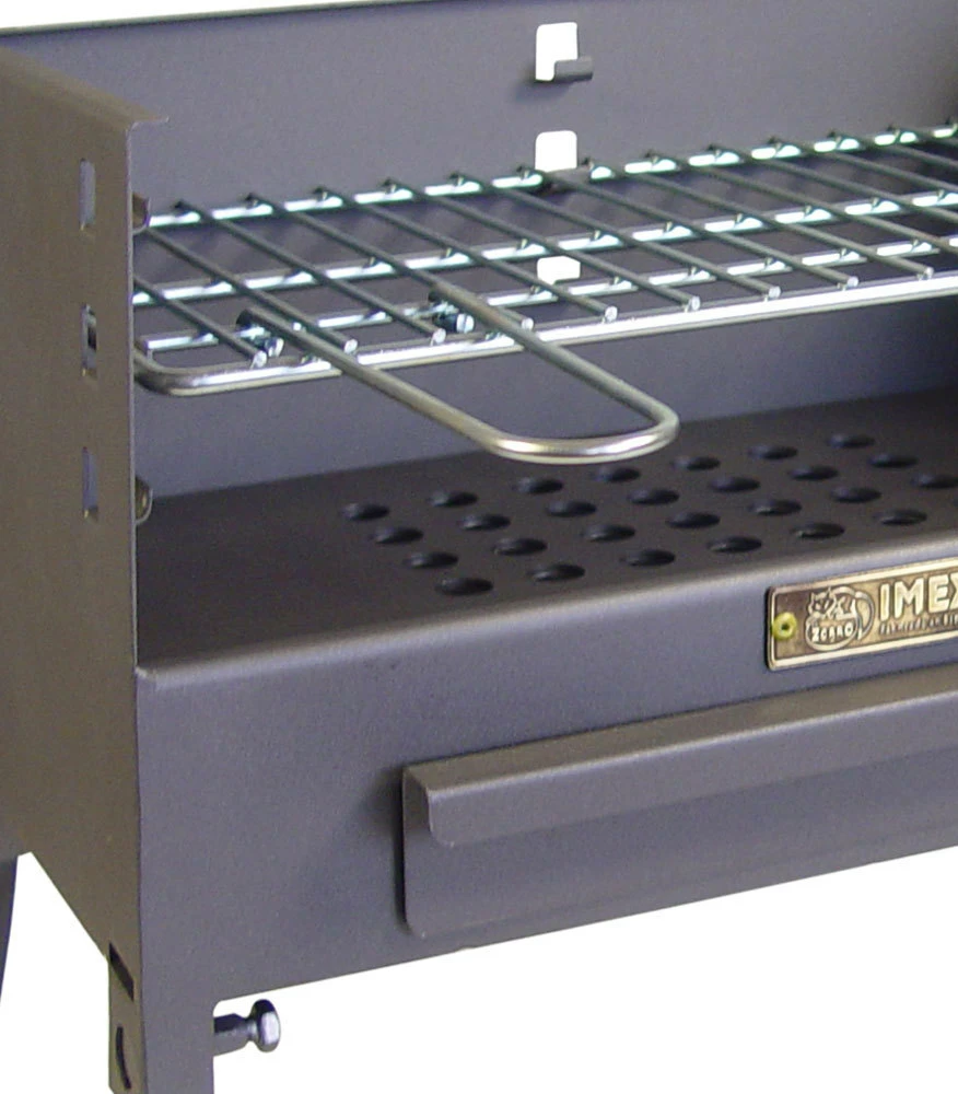 Se compone de un cuerpo de acero forjado con pintura resistente al fuego hasta 800 ºC, 4 patas desmontables, cajón cenicero extraíble y parrilla cincada con mangos.