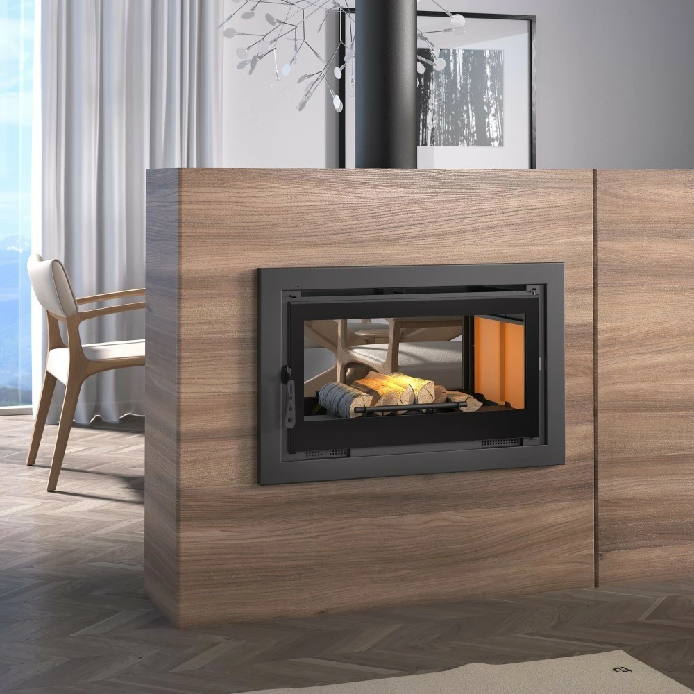 Excelente insertable de leña, del que se ha conseguido un gran aprovechamiento de su poder calorífico, haciendo muy confortable cualquier estancia en su hogar. Con embellecedor hecho a medida.