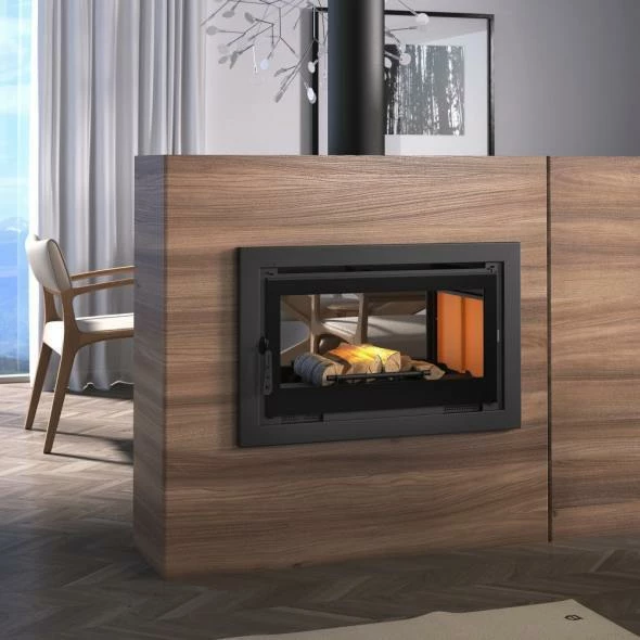 Excelente insertable de leña, del que se ha conseguido un gran aprovechamiento de su poder calorífico, haciendo muy confortable cualquier estancia en su hogar. Con embellecedor hecho a medida.