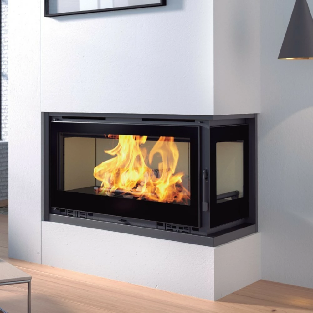 Magnífico insertable de leña, ideal para cualquier tipo de vivienda. Con una baja emisión de CO2 y un rendimiento superior al 70%, conseguimos un producto de alta calidad. También disponible con el cristal lateral orientado hacia la derecha.