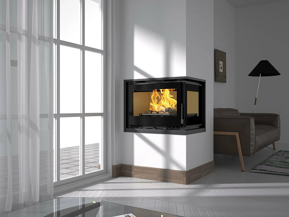 Magnífico insertable de leña, ideal para cualquier tipo de vivienda. Con una baja emisión de CO2 y un rendimiento superior al 70%, conseguimos un producto de alta calidad. También disponible con el cristal al lado izquierdo.