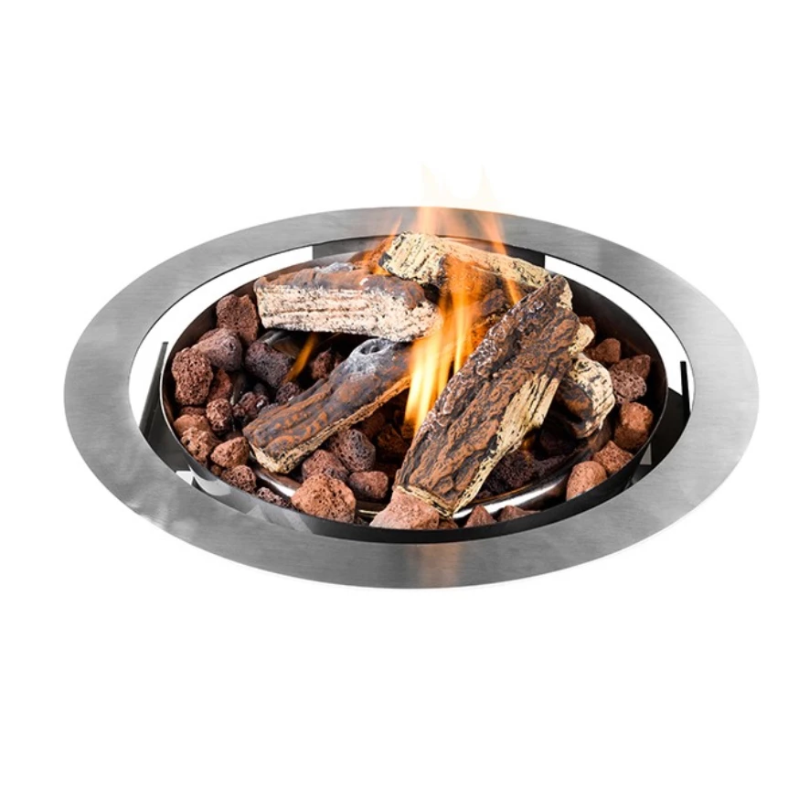 El responsable de la gran potencia calefactora de este brasero es su quemador de Acero Inoxidable de 12 kW. Dicho quemador queda camuflado bajo los troncos de madera cerámica y las piedras volcánicas ya incluidas.