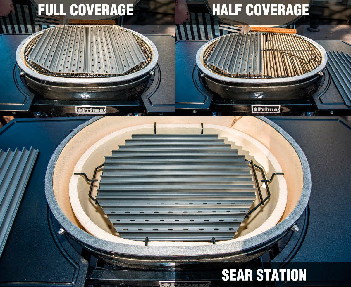 Este modelo de GrillGrate se compone de 4 piezas de 44,14 x 13,34 cm. (Fondo x Ancho) y encaja perfectamente en el modelo de Kamado Primo Oval XL.